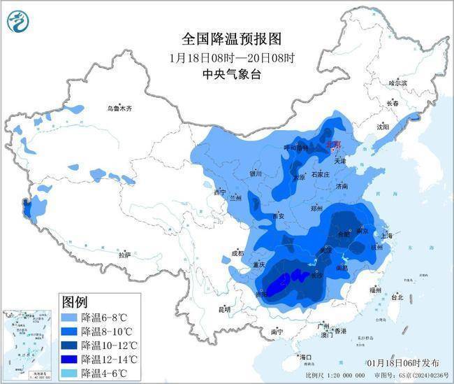 r预计,1月18日8时至20日8时,甘肃、内蒙古中西部、宁夏、陕西、华北、黄淮、江汉、江淮、江南等地气温下降6℃~10℃,其中,内蒙古中部、山西西部、安徽、湖北东部、湖南、贵州东部等地部分地区降温可达10℃~14℃。