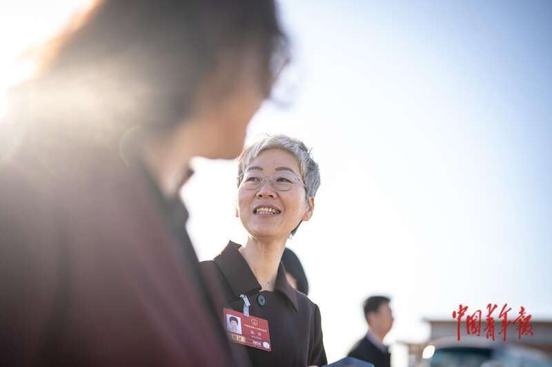 3月9日,北京,十四届全国人大四次会议第二次全体会议开始前,全国人大代表、浙江省嘉兴市第一医院内科主任张齐在广场上。她建议“给男性的育儿假要长一点。”中青报·中青网记者 李隽辉/摄