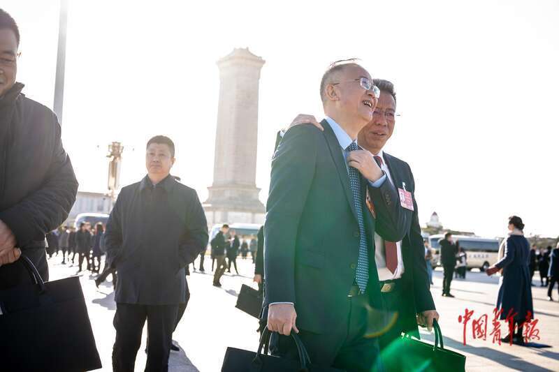 3月9日,北京,十四届全国人大四次会议第二次全体会议开始前,广东团部分全国人大代表在广场上合影。中青报·中青网记者 李隽辉/摄