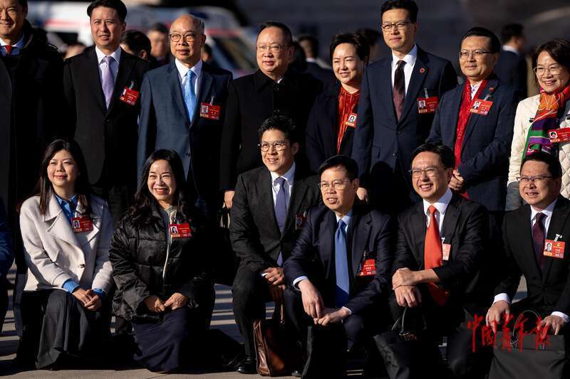 3月9日,北京,十四届全国人大四次会议第二次全体会议开始前,香港团部分全国人大代表在广场上合影。中青报·中青网记者 李隽辉/摄