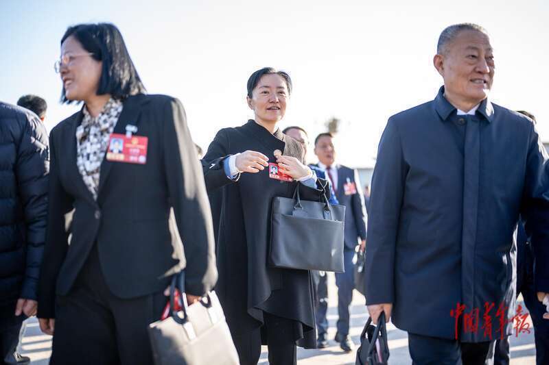 3月9日,北京,十四届全国人大四次会议第二次全体会议开始前,全国人大代表、宿迁市委书记盛蕾(中)步入会场。中青报·中青网记者 李隽辉/摄