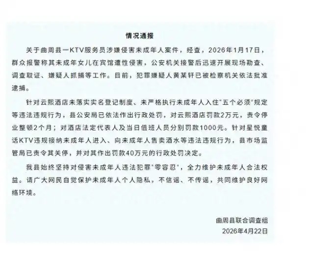 4月22日,河北曲周县联合调查组发布情况通报:关于曲周县一KTV服务员涉嫌侵害未成年人案件,经查平台配资,2026年1月17日,群众报警称其未成年女儿在宾馆遭性侵害,公安机关接警后迅速开展现场勘查、调查取证、嫌疑人抓捕等工作。目前,犯罪嫌疑人黄某轩已被检察机关依法批准逮捕。针对云熙酒店未落实实名登记制度、未严格执行未成年人入住“五个必须”规定等违法违规行为,县公安局已依法作出行政处罚,对云熙酒店罚款2万元,责令停业整顿2个月;对酒店法定代表人及当日值班人员分别罚款1000元。针对星悦童话KTV违规接纳未成年人进入、向未成年人售卖酒水等违法违规行为,县市场监管局已责令其关停,并对其作出罚款40万元的行政处罚决定。我县始终坚持对侵害未成年人违法犯罪“零容忍”,全力维护未成年人合法权益。请广大网民自觉保护未成年人个人隐私,不信谣、不传谣,共同维护良好网络环境。